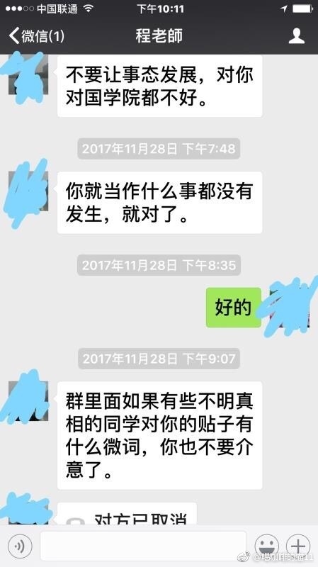 据小柔描述,此事发生之后,小柔曾试图与南昌大学国学院院长程某举报此事,然而程某在了解事态后,非但没有帮助小柔处理此事,反而要小柔顾及国学院名誉,要小柔平息此事。
